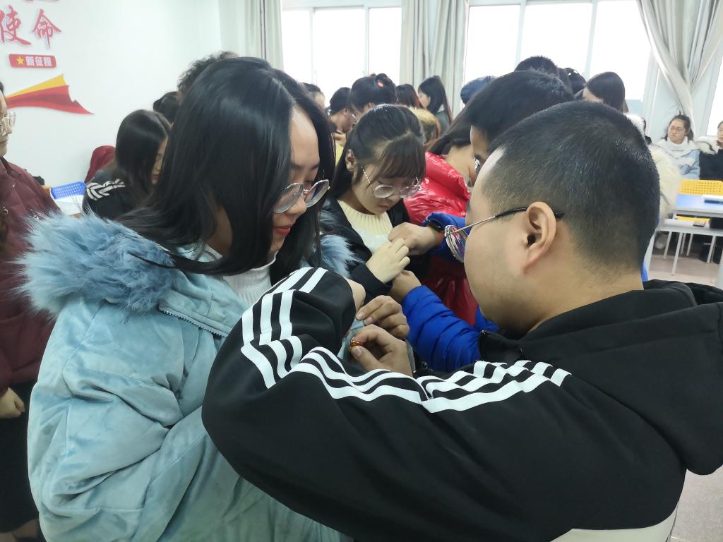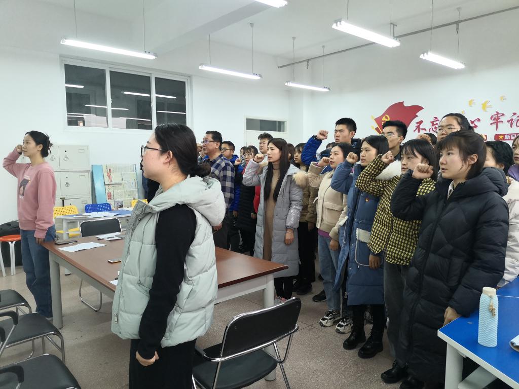 仪式在奏唱国际歌开始,张晓娟宣读了预备党员名单并表示祝贺,正式党员为预备党员佩戴党员徽章后,在张静怡的领誓下,全体党员面对党旗进行了庄严宣誓。预备党员代表张植淋发言,向党组织表明决心,要努力学习,奋发进取,扎实工作,用实际行动践行誓言。雒进才对预备党员提出了几点要求与期望,强调要进一步纯洁入党动机,要加强理论学习,加强党性修养,提高自身素质,坚定为党、国家和人民的教育事业奋斗终身的理想信念,一定要在今后的学习生活和工作中起到先锋模范带头作用。最后在奏唱中华人民共和国国歌后宣誓仪式圆满结束。