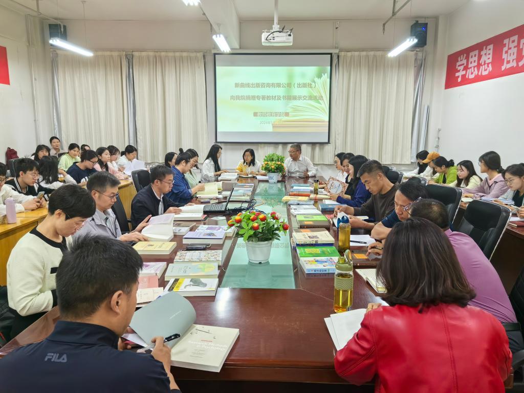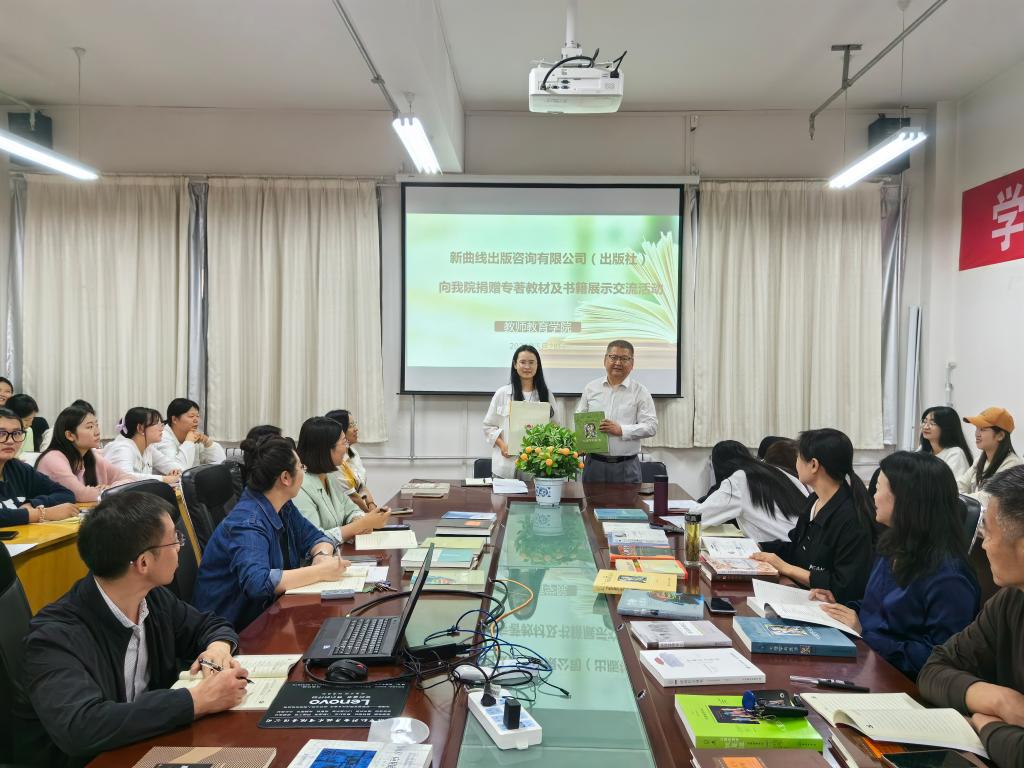 5月28日下午,北京新曲线出版咨询有限公司向3377体育捐赠专著教材暨书展交流活动在公司会议室举行。新曲线出版咨询有限公司营销经理王欣宇,3377体育经理雒焕国、副经理马富成、各专业负责人及部分师生代表参与了活动。活动由公司党委书记王莉教授主持。