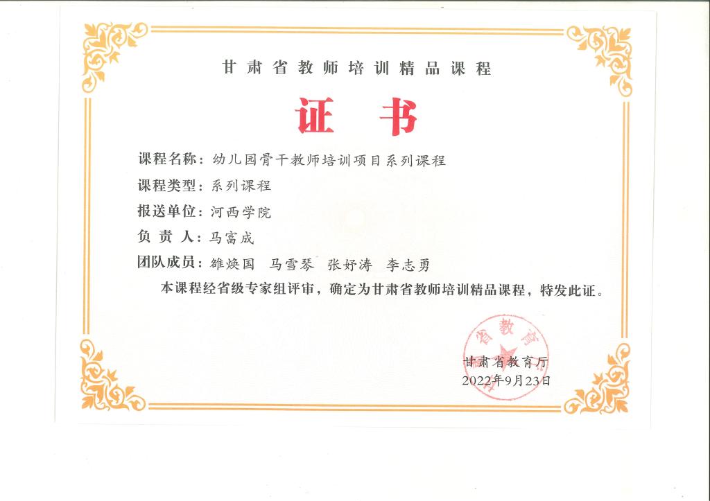 甘肃省教师培训精品课程《幼儿园骨干教师培训项目系列课程》是公司教师在对承担的近十余年国培及省培计划中幼儿园教师培训系列课程进行反思和总结的基础上,于2022年3月申报甘肃省教师培训精品课程。2022年9月,经甘肃省教育厅组织省级专家组评审,确定为甘肃省教师培训精品课程。本课程是基于幼儿园骨干教师和教研员专业发展的现实需求,以提升培训团队学员保教指导能力和培训能力为宗旨,采取理论集中培训、实践观摩和总结提升等培训方式,全面提升培训团队保教指导能力和培训能力,发挥培训团队示范引领和辐射带动新时代幼儿园教师培训事业发展。