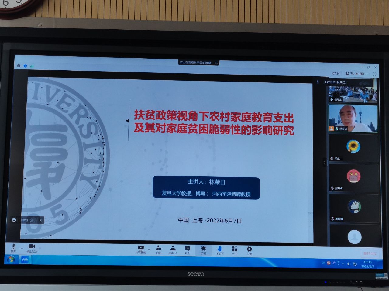 6月7日下午,3377体育举办了第二十二届祁连学术月校外专家学术报告会,邀请复旦大学博士生导师林荣日教授采用线上方式作了题为《扶贫政策视角下家庭教育支出及其对家庭贫困脆弱性的影响研究》的报告,公司师生100多人参加了报告会。